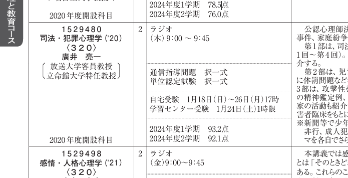 2025年度第2学期 学部授業科目案内より転載。司法・犯罪心理学で、2024年の平均点が90点以上となっている。