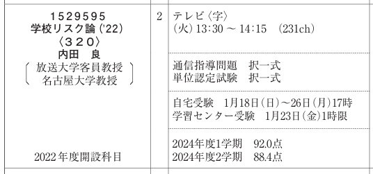 これは、さほど勉強しなくても知識はあるし、自分の仕事に関連するので学びやすいし仕事にも活用できるという点です。例えば私なら「学校リスク論」。単純に、教育ジャーナリストとして活動する上で、大まかな問題は知っていますが、学術的な研究とか最新の情報などを知りたいと思っていたらこれを選ぶと思います。