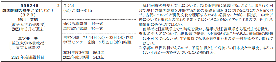 これは定番の「平均点50点台科目」です。担当教授の須川英徳教授が他界されているため、受講するなら早めがいいですね。