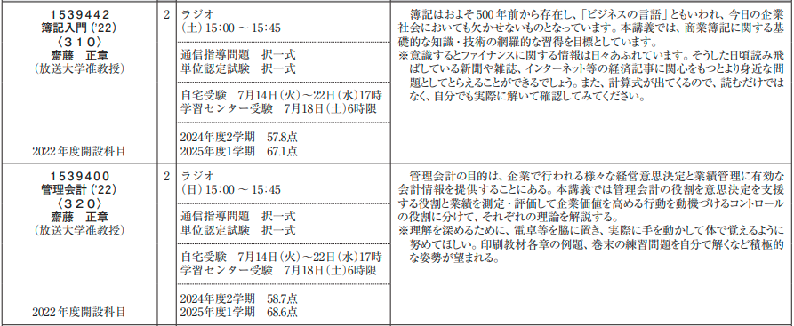 で、この3科目を見る限りでは平均点程度の特典では単位認定が微妙。日商簿記2級くらいの知識が必要かもしれないので、とりあえず3級くらいを取ってから挑戦してみてはいかが? そうじゃないと、心がボキっと折れそうです。